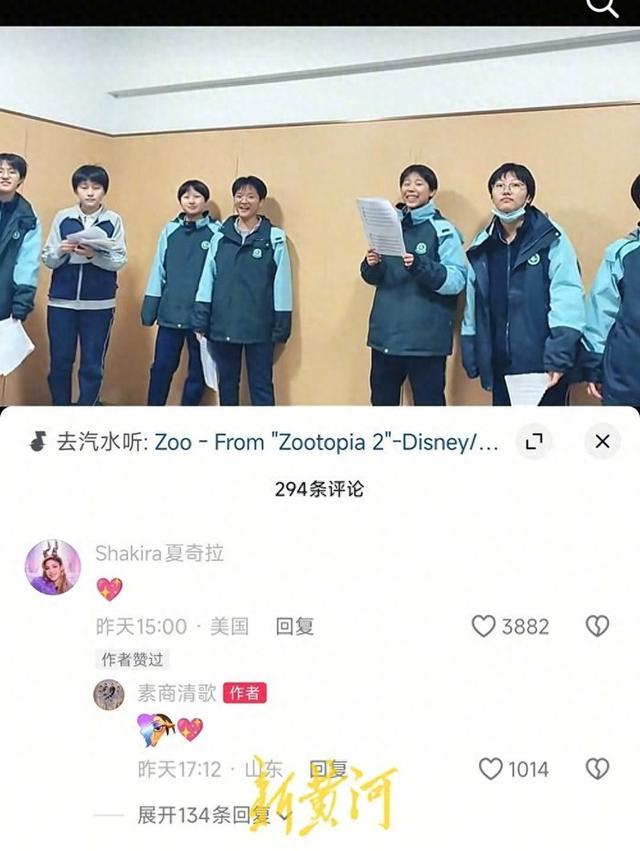 镜头前,十余名身着投降的学生围成半圆,东说念主声交汇改换,演绎着电影《大肆动物城2》的主题曲《Zoo》。在互联网的另一端,一位相当的不雅众在留言区留住了一颗“爱心”。她是歌曲的原唱者、拉丁天后夏奇拉。