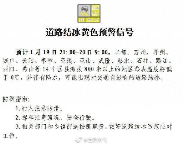 重庆市安逸台1月19日晚发布说念路结冰黄色预警信号:预测1月19日21:00—20日9:00竞猜大厅真人,丰皆、万州、开州、城口、云阳、奉节、巫溪、巫山、武隆、彭水、石柱、黔江、酉阳、秀山等14个区县海拔800米以上的地区路表温度将低于0℃,并伴有降水竞猜大厅真人,可能出现对交通有影响的说念路结冰。